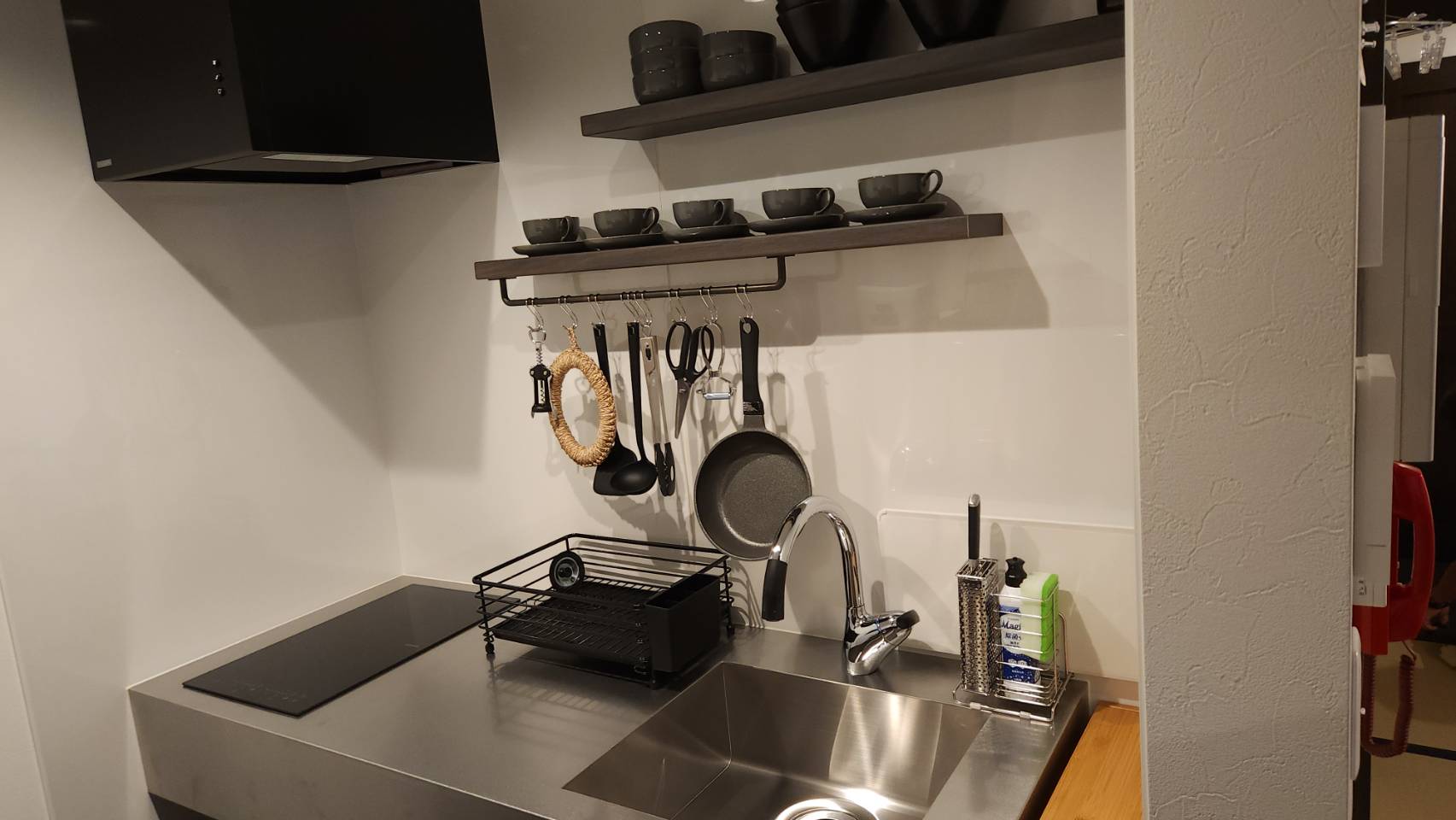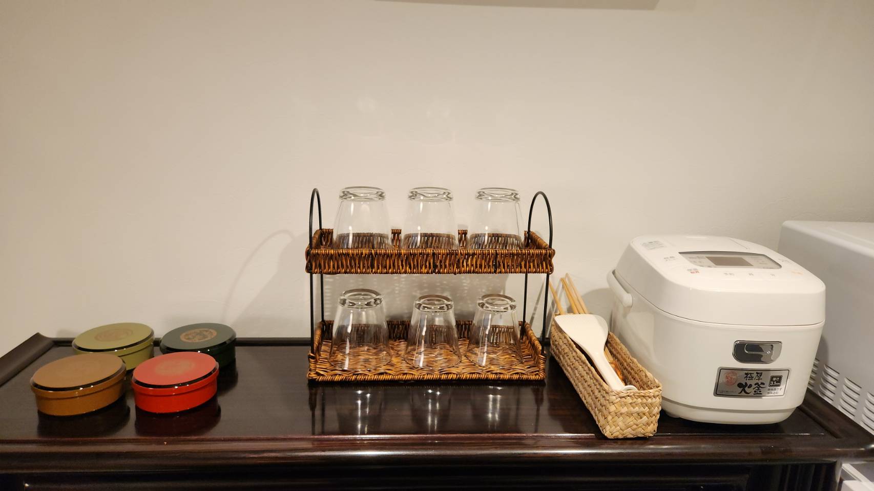 冷蔵庫・炊飯器・IHクッキングヒーター・電子レンジ・トースター・湯沸かしポット・調理道具一式・食器類