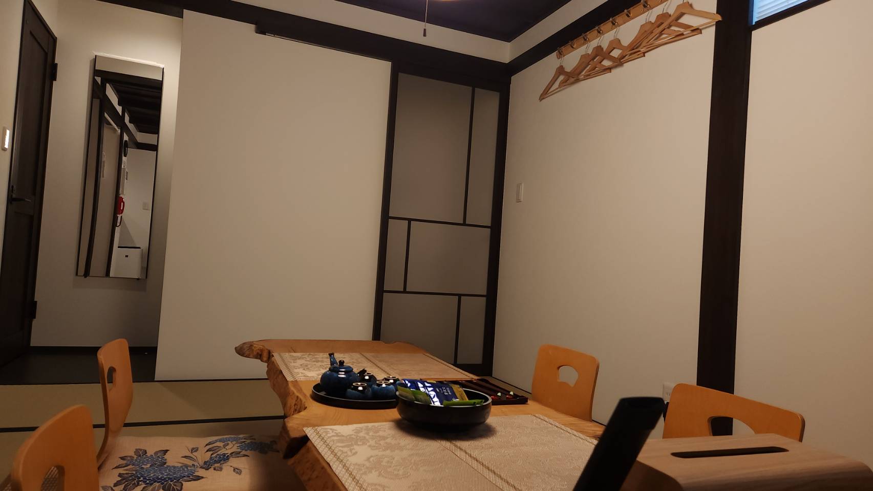 伝統美が息づく、一棟貸し民泊のくつろぎ空間。畳の上で足を伸ばし、無垢材のテーブルを囲んで語らうひととき。穏やかな時間が流れる中、金沢の静寂と共に贅沢なひとときをご堪能ください。